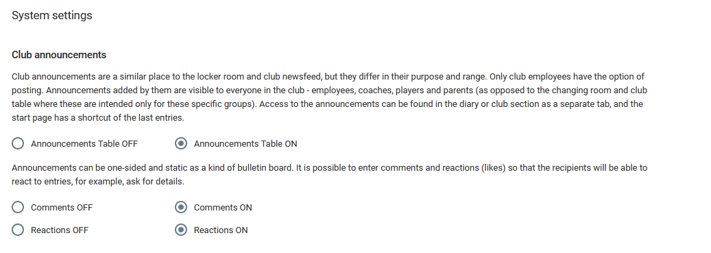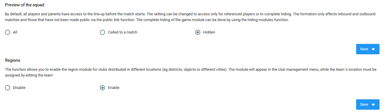 Zde spravujete viditelnost: záložky pro oznámení, náhledy sestavy zápasu, záložky regionů a zda bude uživatel moci zanechat reakce a komentáře pod příspěvkem na nástěnce a v šatně. Zde také konfigurujete automatické platby DotPay, ale o tom jsme již mluvili v předchozích kapitolách.