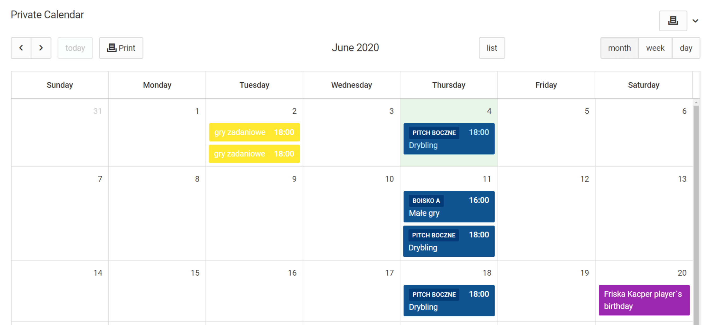 Der private Kalender ist der Standardort, zu dem Sie gelangen, wenn Sie sich im System anmelden. In diesem Kalender können Sie alle Ereignisse, Spiele und Trainings sehen, die Sie betreffen, unabhängig von Ihrer aktuellen aktiven Rolle. Das bedeutet, wenn Sie der Trainer von drei Teams sind, zeigt der Kalender Zeitpläne, Spielpläne und Ereignisse für die drei Teams, die Sie leiten, sowie andere persönliche Einträge.