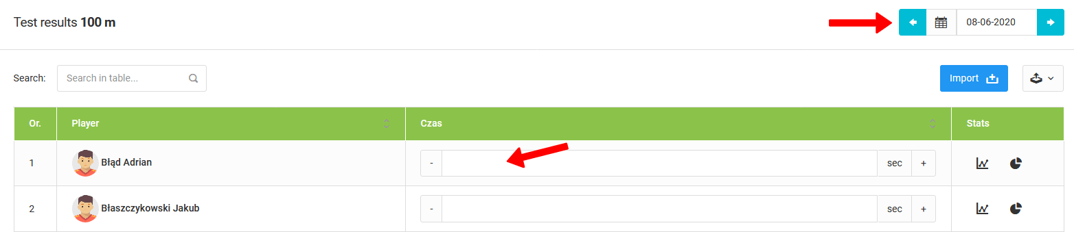 Um mit der Eingabe der Ergebnisse zu beginnen, müssen Sie im linken Menü auf "Testliste" klicken. Nach dem Klicken gelangen Sie zur Liste der Tests. Dort finden Sie Ihre Tests und einige von uns vorbereitete Basistests. Dazu gehören ein 5m-Lauf, 20m-Lauf, 30m-Lauf und Beep-Test. Wenn Sie auf einen bestimmten Test klicken, sehen Sie eine Liste der Spieler, die an dem Test teilnehmen. Wenn es am aktuellen Tag keine Tests gab, sehen Sie leere Felder mit Platz zur Eingabe von Testergebnissen. Um das Datum des Tests zu ändern, klicken Sie auf das Datumsfeld in der oberen rechten Ecke des Fensters.