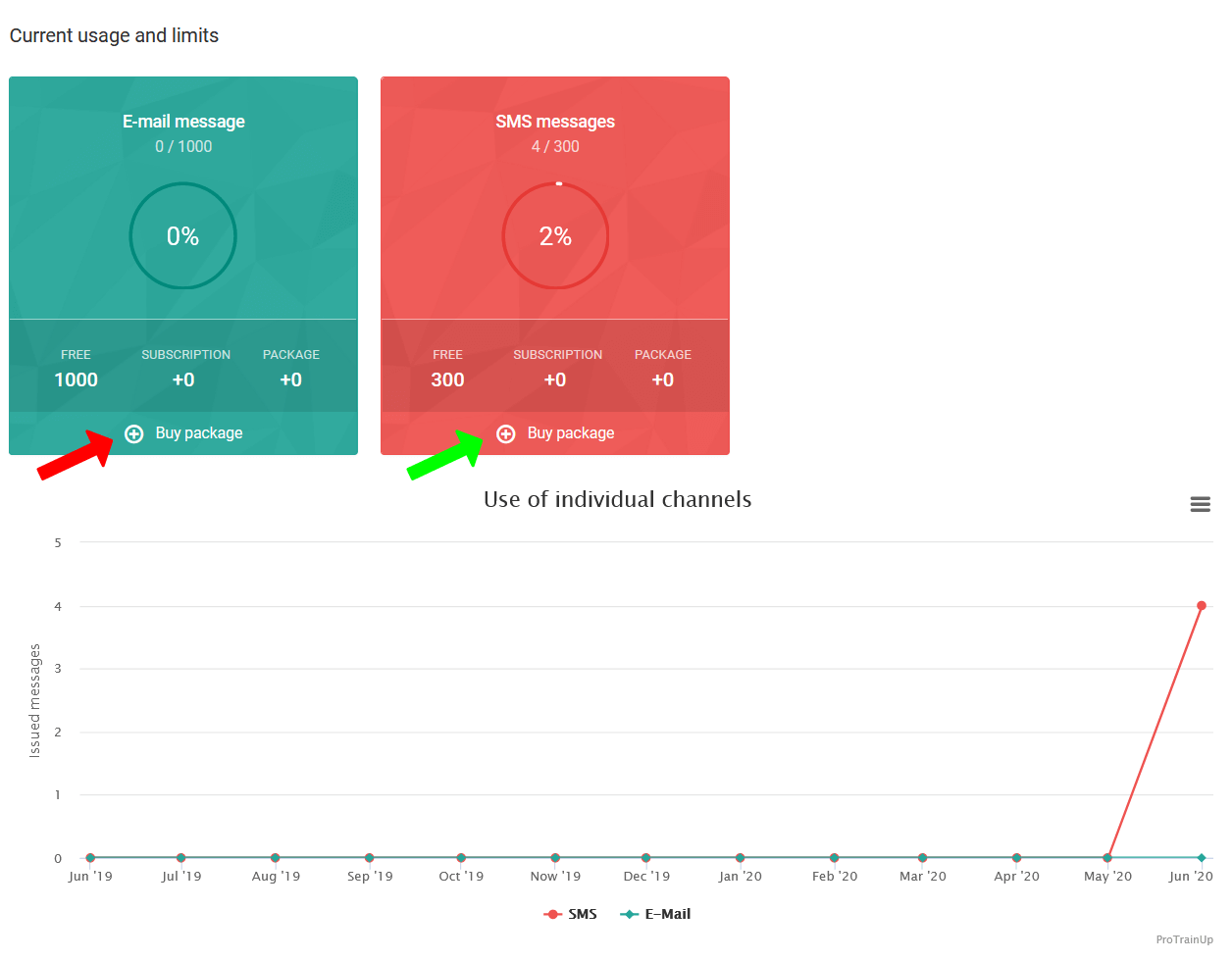 Here you can also check the current statistics of package consumption. To buy an additional package via SMS or email, click on the "buy package" button indicated in the picture. After clicking it, you will be taken to the message package purchase page. Remember that each purchased package is valid until the last day of the month! The unused package is not being transferred to the next month!
