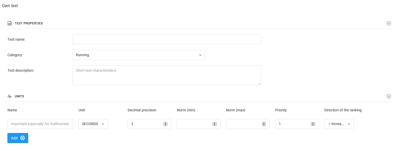Pour créer un test, sélectionnez dans le menu de gauche : journal tests créer un nouveau test. Ensuite, la fenêtre de création de test s'ouvrira. Dans cette fenêtre, vous avez plusieurs champs importants à compléter. Le premier est le nom du test, le suivant est la catégorie et la description du test. En dessous se trouve un champ pour entrer des informations sur ce que vous mesurez, quelle unité de mesure et quelles sont les normes du test. Vous avez également la possibilité de créer des tests multidimensionnels en ajoutant d'autres facteurs mesurés dans un test donné. Pour ajouter un autre facteur, cliquez sur le bouton bleu "ajouter".