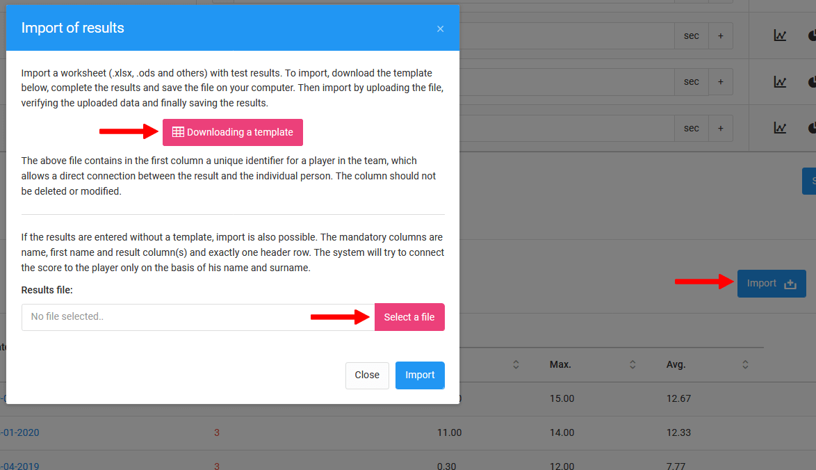 Le système vous permet de charger les résultats de test depuis un fichier xls préalablement préparé. Pour ce faire, cliquez sur l'icône bleue "importer" dans la fenêtre de saisie des résultats de test. Ce clic ouvrira une fenêtre où vous pourrez télécharger le modèle de fichier ou charger le fichier xls déjà complété. Pour vous assurer que les données seront bien lues et attribuées aux joueurs respectifs, nous recommandons d'utiliser un fichier modèle xls.