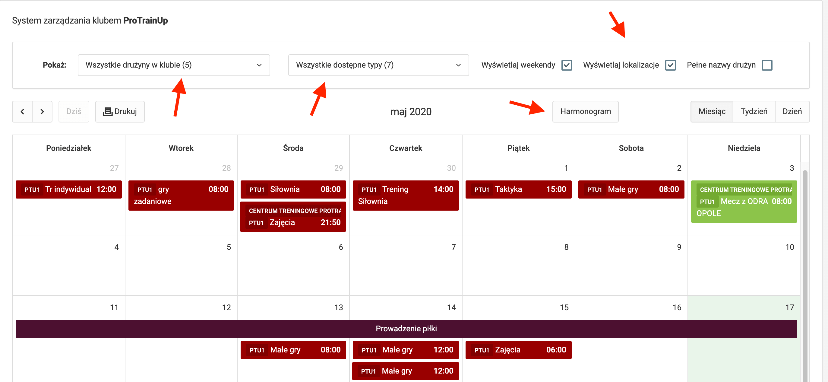 Naciskając w przycisk "harmonogram", kalendarz przyjmie formę tabelaryczną, dzięki czemu będziesz mógł wygodnie go zapisać jako pdf lub wydrukować. Kolory wydarzeń - typ trening, będą w kolorach drużyn. Kolor drużyny można zmieniać wchodząc w jej edycję.
