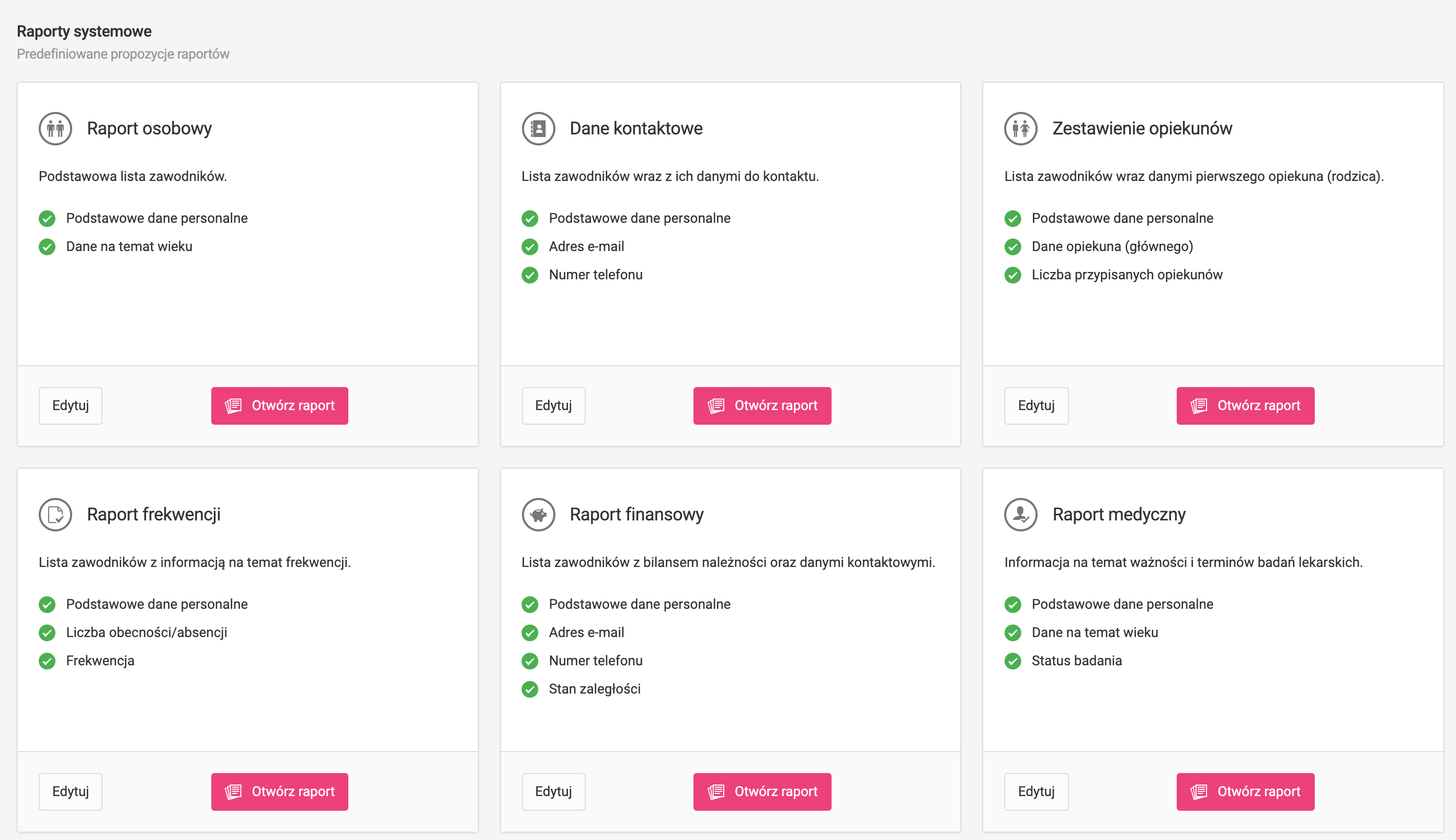 Raporty szczegółowe mogą zawierać praktycznie wszystkie możliwe dane, które aktualnie znajdują się w systemie. Jako użytkownik masz dostęp do kilku predefiniowanych raportów tj.: raport osobowy, dane kontaktowe, zestawienie opiekunów, raport frekwencji, raport finansowy, raport medyczny. Aby otworzyć raport, kliknij w różowy przycisk "otwórz raport".