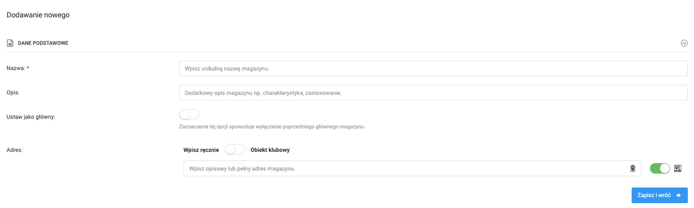 Dodanie nowego magazynu to pierwszy krok, który należy wykonać podczas rozpoczynania pracy z modułem magazynowym. Aby dodać nowy magazyn należy z lewego menu wybrać zakładkę klub sprzęt i magazyny magazyny dodawanie nowego.